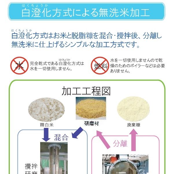 一般的な無洗米加工では、糠を磨くために水を使用します。
